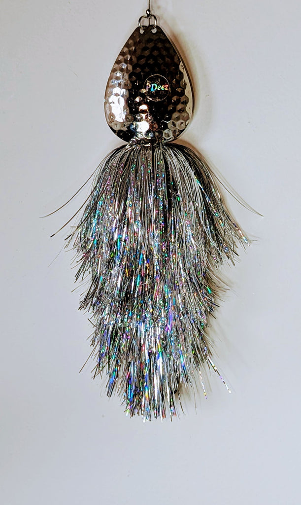 The addition of the BELL has created a bait with a unique unparalleled sound like no other dbl bladed flashabou bucktail!